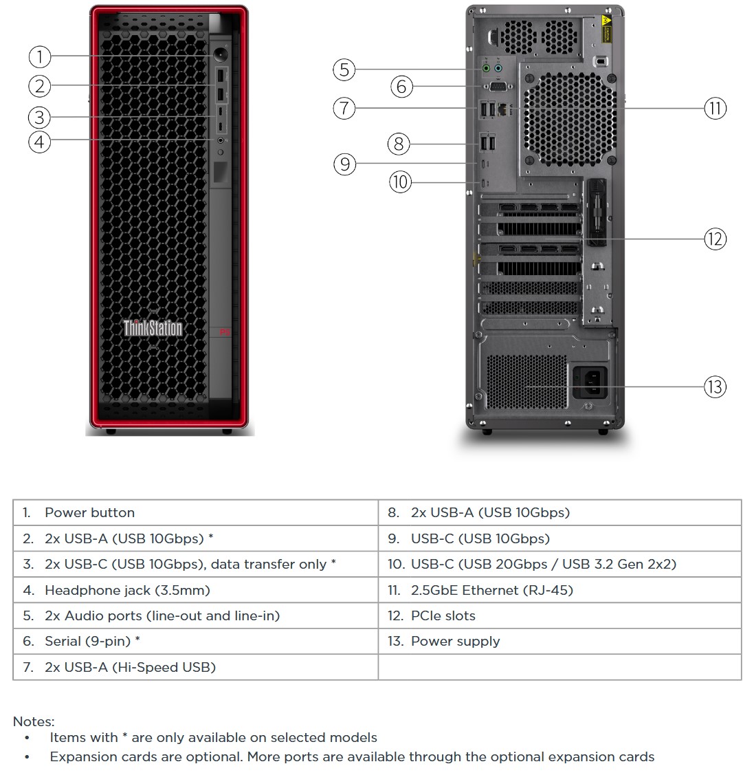 Bei den Anschlüssen ist die ThinkStation P5 Gen 2 modern und professionell aufgestellt. An der Front steht ein Audio Anschluss bereit, optional auch weitere USB A und USB C Ports. Auf der Rückseite gibt es unter anderem USB C mit bis zu 20 Gbit pro Sekunde, mehrere USB A Ports, 2,5 Gigabit Ethernet, Audio Ein und Ausgang sowie optionale serielle oder PS 2 Erweiterungen.