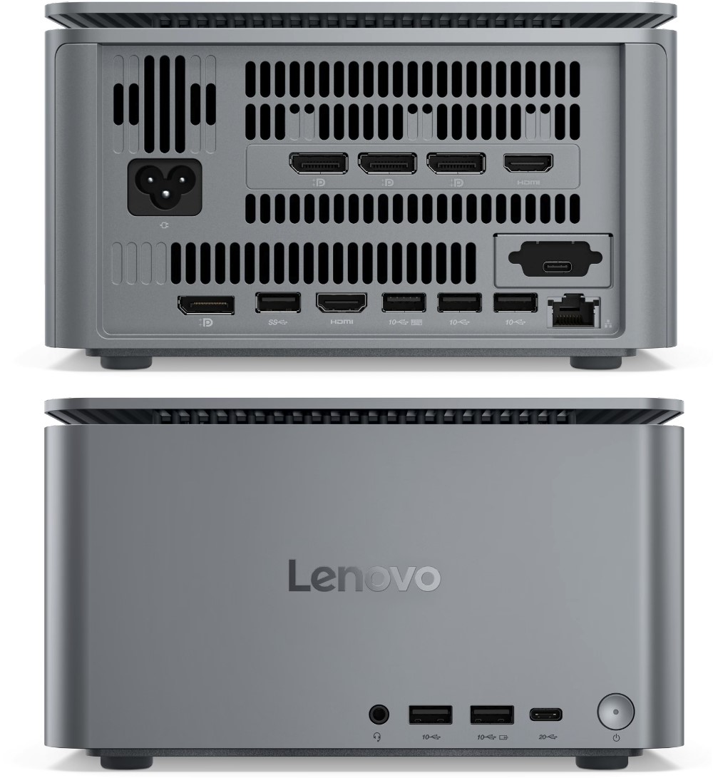 Auch bei den Anschlüssen ist der ThinkCentre neo Ultra Gen 2 sehr modern aufgestellt. Frontseitig stehen USB-C und USB-A bereit, auf der Rückseite ergänzen Thunderbolt 4, mehrere USB-A-Anschlüsse, Ethernet sowie zahlreiche DisplayPort- und HDMI-Ausgänge das System. Dadurch lassen sich Monitore, Zubehör, schnelle Datenträger und Netzwerk besonders flexibel einbinden. Wer einen aufgeräumten, leistungsfähigen Arbeitsplatz einrichten möchte, hat hier viele Möglichkeiten.