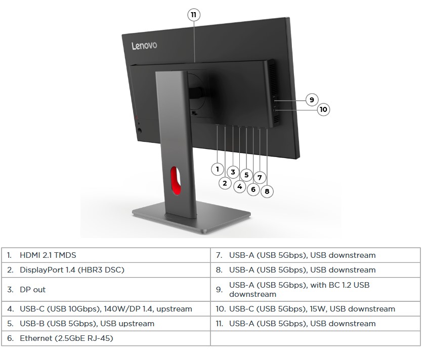 1x USB-C (USB 10Gbps / 3.2 Gen 2) with USB PD 3.1 up to 140W and DisplayPort 1.4 Alt Mode HBR3, USB upstream